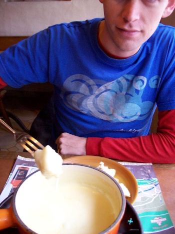 Switzerland, we wanted to sample authentic cheese fondue. As we walked around the town, Dave